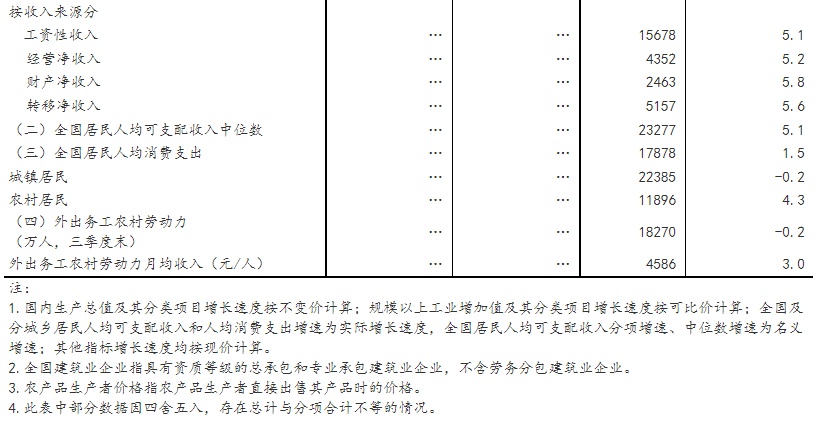前三季度,全国居民人均可支配收入27650元,同比名义增长5.3%;扣除价格因素实际增长3.2%,比上半年加快0.2个百分点。按常住地分,城镇居民人均可支配收入37482元,同比名义增长4.3%,实际增长2.3%;农村居民人均可支配收入14600元,同比名义增长6.4%,实际增长4.3%。从收入来源看,全国居民人均工资性收入、经营净收入、财产净收入、转移净收入分别名义增长5.1%、5.2%、5.8%、5.6%。全国居民人均可支配收入中位数23277元,同比名义增长5.1%。