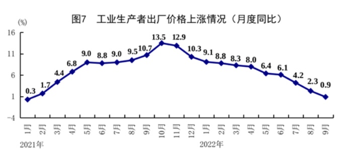 前三季度,全国工业生产者出厂价格同比上涨5.9%,涨幅比上半年收窄1.8个百分点。三季度工业生产者出厂价格同比上涨2.5%。其中,9月份工业生产者出厂价格同比上涨0.9%,环比下降0.1%。前三季度,全国工业生产者购进价格同比上涨8.3%,涨幅比上半年收窄2.1个百分点;其中,9月份同比上涨2.6%,环比下降0.5%。