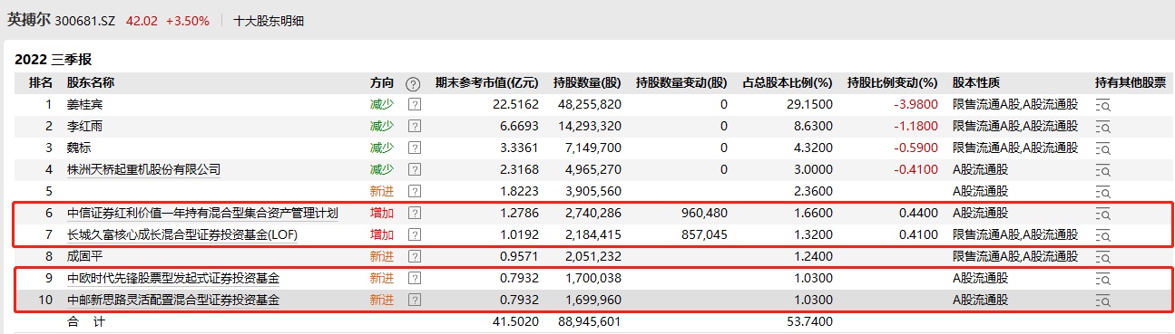 智通财经APP获悉,10月24日,英搏尔(300681.SZ)发布的三季报中,显示了前十大股东最新持股情况。中欧基金周蔚文、中邮基金国晓雯、长城基金陈良栋、中信基金刘琦三季度均增持英搏尔。