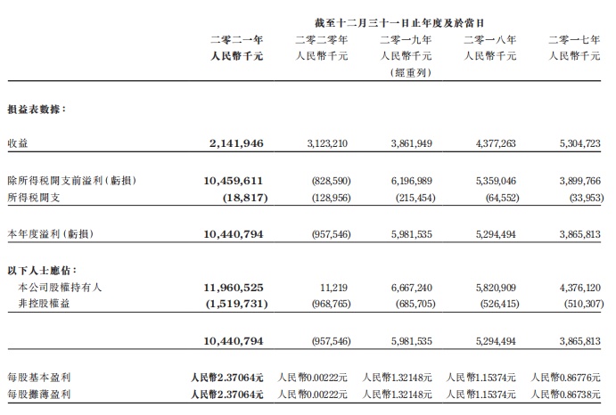2021年公司营收21.42亿元,总比下降31.4%,收益减少主要是由于华晨雷诺汽车销量下跌及华晨东亚汽车金融收益贡献减少所致。