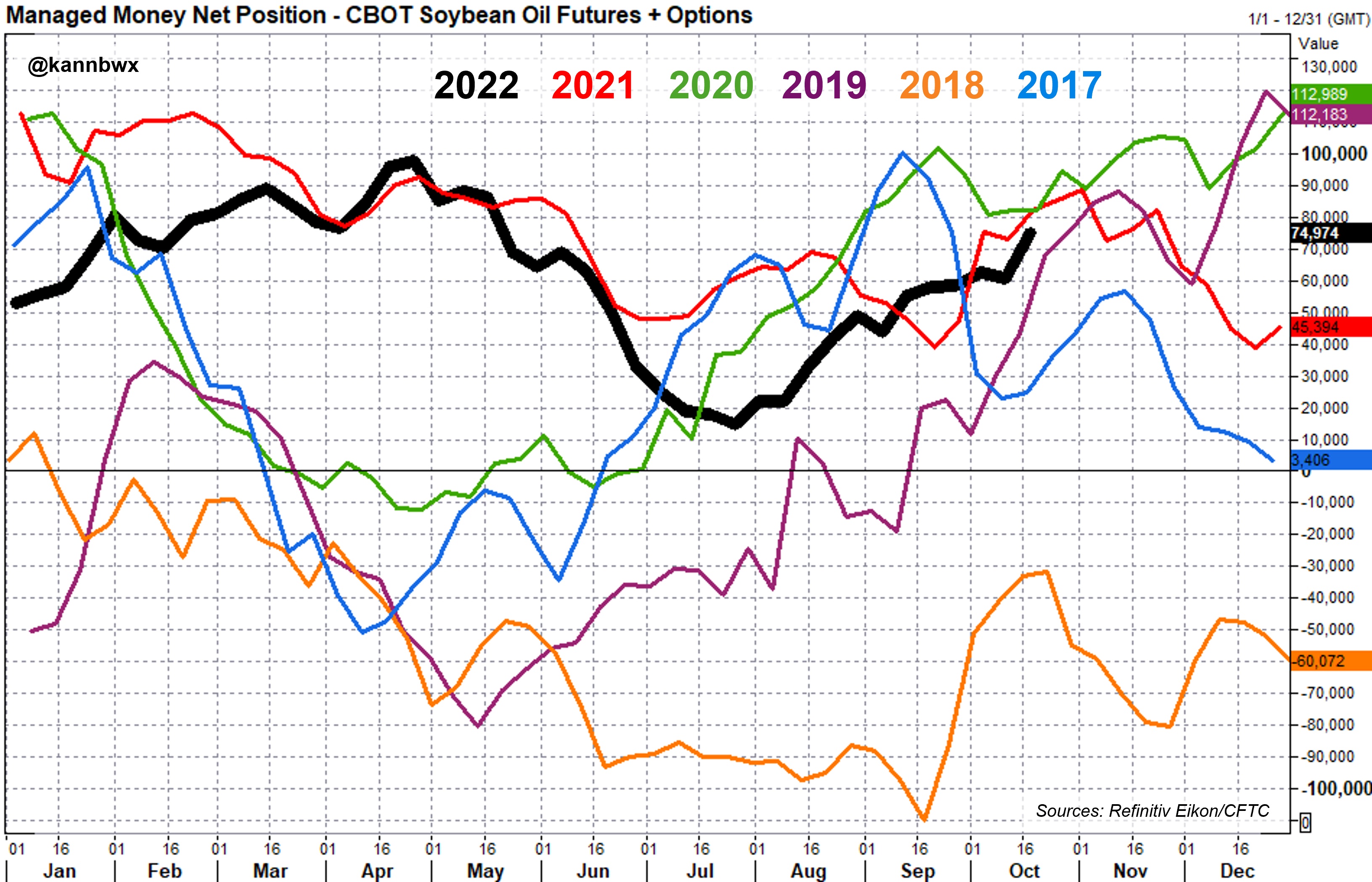 豆油和豆粕期货在过去三个交易日均上涨4%,豆油的涨幅超过70美分/磅。然而,截至10月18日,当周未平仓头寸落后于过去几年,豆油处于8年低点,而豆粕处于9年低点。
