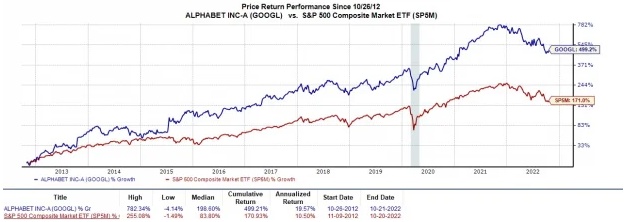今年以来,因为经济形势对科技股来说更加艰难,谷歌股价下跌了30%,表现不及标普500指数(下跌24%)。然而,在过去10年里,Alphabet仍然上涨了499%,超过了标普500指数。