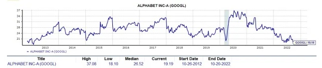 鉴于谷歌过去的出色表现,今年该公司股价的下跌可能会成为长期投资者的一个买入机会。目前,谷歌的股价约为101美元,市盈率为19.1倍。这与行业平均水平持平,远低于37倍的10年高点和26.5倍的中值。