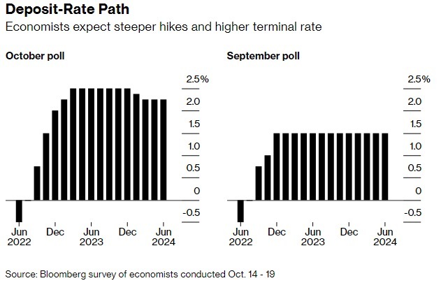 接受彭博社调查与访问的分析师普遍预计,存款利率将在明年3月份达到2.5%的峰值,同时他们预计本月之后欧洲央行加息的步伐将会放缓。