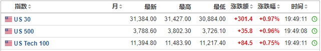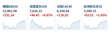 2. 截至发稿,德国DAX指数涨1.85%,英国富时100指数涨0.67%,法国CAC40指数涨2.06%,欧洲斯托克50指数涨1.83%。