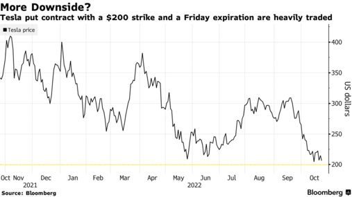 智通财经APP获悉,特斯拉(TSLA.US)周一下跌1.49%,收于211美元附近,在标普500指数成分股中表现靠后。期权交易员押注该股可能在周末之前将进一步下跌,周五到期、行权价为200美元的看跌期权合约是特斯拉期权中周一交易量最大的合约,也是全天美国交易所最受欢迎的15种合约之一,这意味着该股本周可能还会下跌5%。