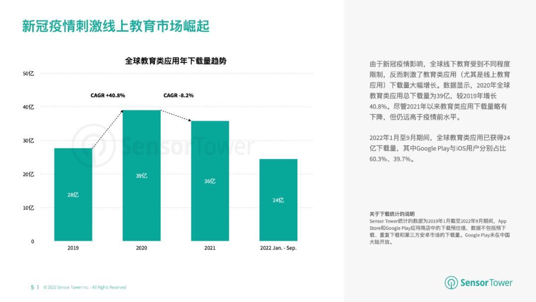 2020年全球教育类应用总下载量为39亿,较2019年增长40.8%。