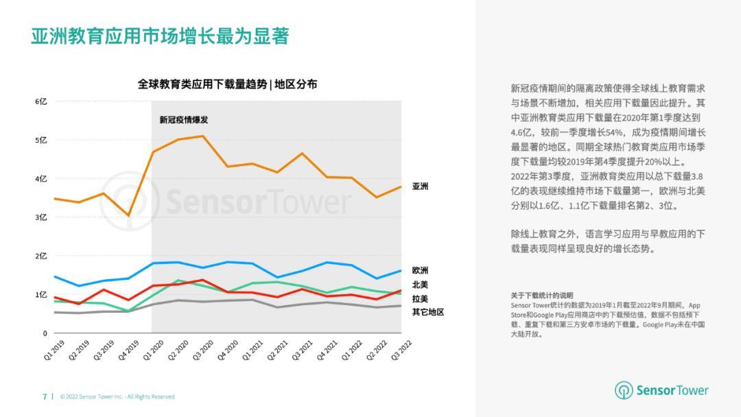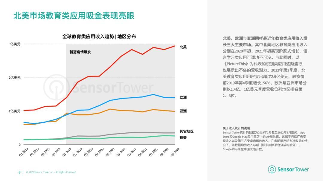 2022年第3季度,北美教育类应用用户支出超过2.9亿美元,较疫情前2019年第4季度增长156%。欧洲与亚洲市场分别以1.4亿、1亿美元季度营收位列地区排名第2、3位。