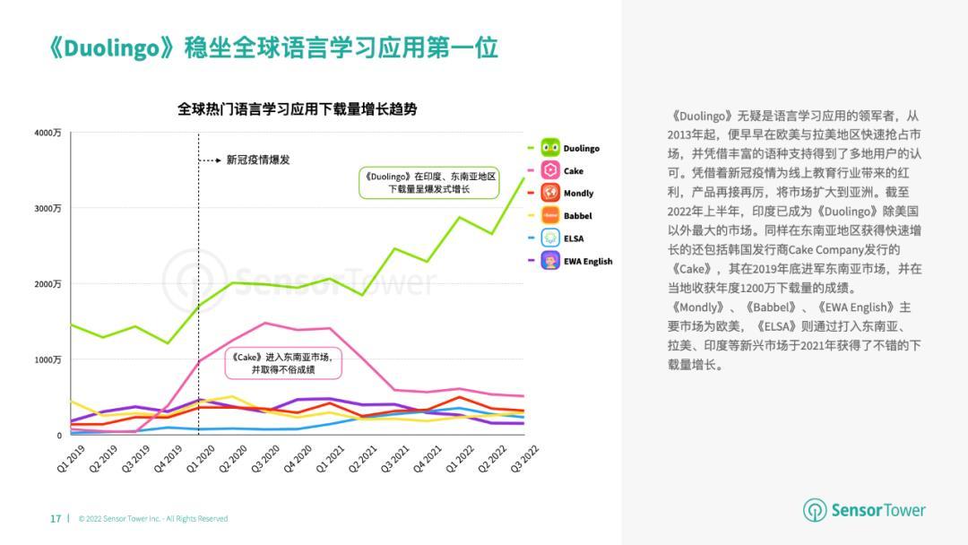 《Duolingo》无疑是语言学习应用的领军者,从2013年起,便早早在欧美与拉美地区快速抢占市场,并以丰富的语种支持得到了多地用户的认可。凭借着新冠疫情为线上教育行业带来的红利,产品继续将市场扩大到亚洲。截至2022年上半年,印度已成为《Duolingo》除美国以外最大的市场。同样在东南亚地区获得快速增长的还包括韩国发行商Cake Company发行的《Cake》,其在2019年底进军东南亚市场,并在当地收获年度1200万下载量的成绩。《Mondly》、《Babbel》、《EWA English》的主要市场为欧美;《ELSA》则通过打入东南亚、拉美、印度等新兴市场于2021年获得了不错的下载量增长。