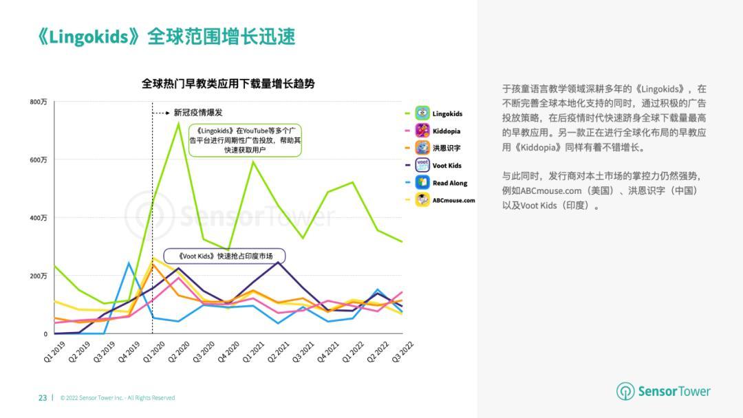 早教应用市场同样在疫情之后出现新的格局。于孩童语言教学领域深耕多年的《Lingokids》,在不断完善全球本地化支持的同时,通过积极的广告投放策略,在后疫情时代快速跻身全球下载量最高的早教应用。另一款正在进行全球化布局的早教应用《Kiddopia》同样有着不错增长。与此同时,发行商对本土市场的掌控力仍然强势,例如ABCmouse.com(美国)、洪恩识字(中国)以及Voot Kids(印度)。因此如何对抗本土产品进而渗透当地市场,将成为发行商面临的一大挑战。