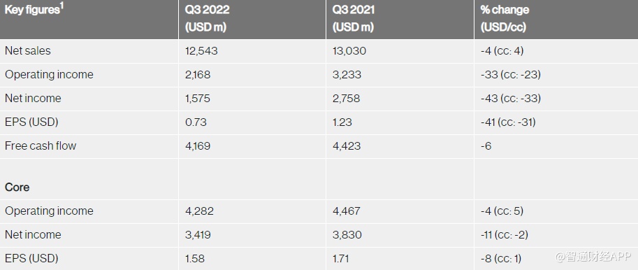 智通财经APP获悉,诺华制药(NVS.US)公布第三季度业绩。数据显示,该公司第三季度销售额为125.43亿美元,同比下降4%,按固定汇率计算则增长4%,低于市场预期的129亿美元;净利润为15.75亿美元,同比下降43%,按固定汇率计算则下降33%;每股收益为0.73美元,上年同期为1.23美元。