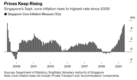 智通财经APP获悉,新加坡统计局的数据显示,该国9月CPI同比增长7.5%,连续第七个月加速,达到近14年高点,这给政策制定者提供了维持紧缩倾向的空间,尽管新加坡自去年10月以来已经采取了五次加息措施。