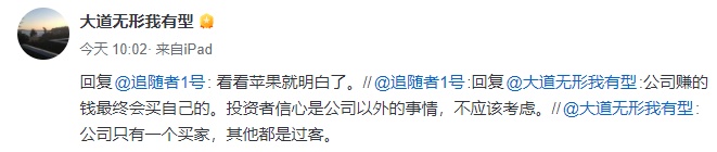 今日早上10点02分,段永平继续在社交平台更新动态,他转发网友留言“公司赚的钱最终会买自己的。投资者信心是公司以外的事情,不应该考虑。”并回复称“看看苹果就明白了。”