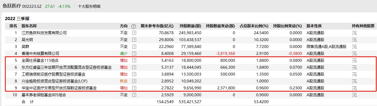 全国社保基金115组合三季度增持鱼跃医疗80万股,环比二季度末变动比例为4.44%,增持后持股数1880万股,期末参考市值为5.42亿元,占总股本持股比例为1.88%。