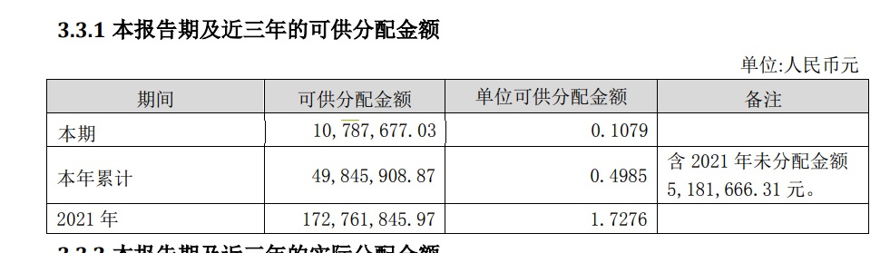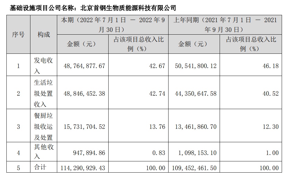 三季报显示,公司总体收入构成目前为发电收入、生活垃圾处置收入、餐厨垃圾收运及处置和其他收入等,合计约1.14亿元,也较去年同期的1.09亿元略有增长。此外,该REIT季内可分配金额1078.77万元,季内没有进行实际分配。