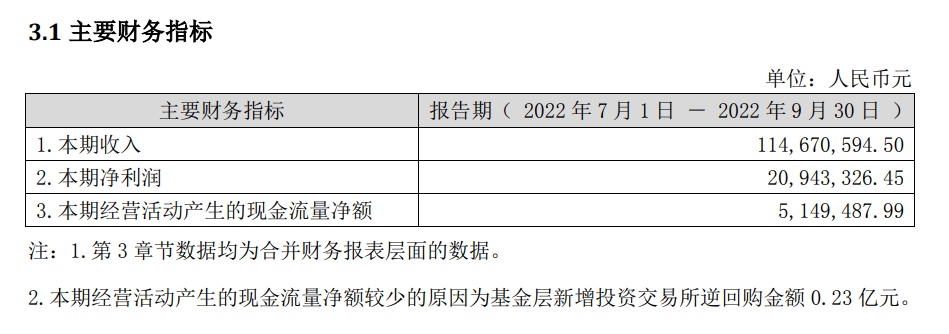 智通财经APP获悉,首份公募REITs三季报出炉,10月25日,中航首钢绿能REIT(180801)披露三季报显示,上市项目公司三季度实现营收约1.15亿元、净利润2094.33万元,但因基金层新增投资交易所逆回购金额0.23亿元,公司目前经营现金流量净额仅514.95万元。