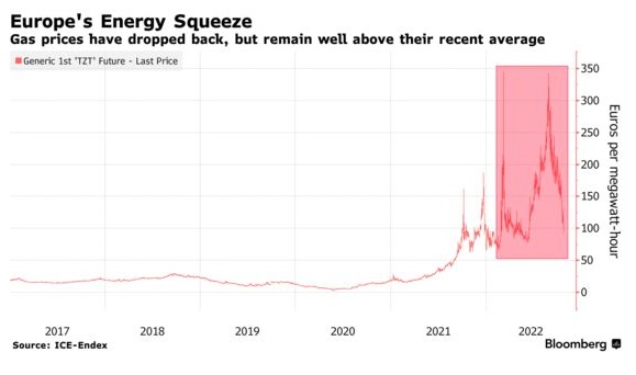 智通财经APP注意到,欧洲天然气价格正从夏季达到的峰值大幅下跌,但企业和家庭将不得不等待通胀飙升带来的压力缓解。本周,天然气基准期货价格自去年6月以来首次跌破每兆瓦时100欧元(合99美元),原因是补充库存的进展好于预期,且天气温和。周二跌幅扩大,从8月底的最高342欧元下跌至92.40欧元,日跌幅一度高达6.8%。