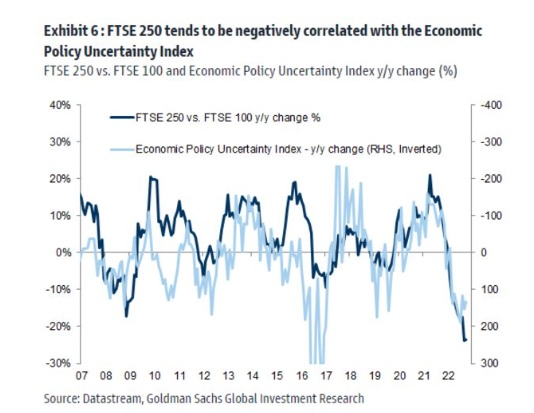 可以肯定的是,在苏纳克的领导下,“缓慢而稳定”的方法对依赖英国经济健康的英国公司来说是积极的。Frikkee表示,“改变立场是最糟糕的做法。”而高盛的一项分析显示,当经济政策的不确定性增加时,富时250指数(FTSE 250)往往会下跌。