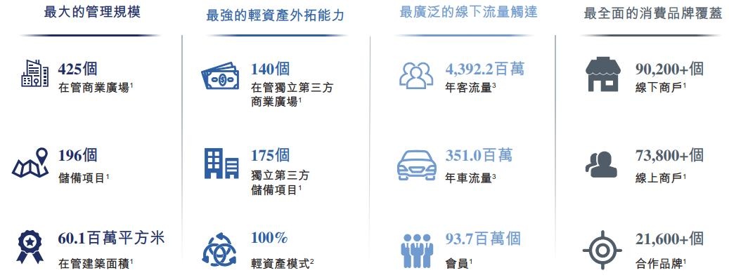 公司为业主提供全流程的商业运营服务,为商户带来大量客流并进行营销赋能,同时满足消费者的综合消费需求。截至2022年6月30日,公司管理425个商业广场,在管建筑面积达6010万平方米。于2019年、2020年及2021年,公司的在管商业广场(不包括停车位)平均出租率为98.8%。截至2022年6月30日,公司有196个储备项目,包括175个独立第三方项目。