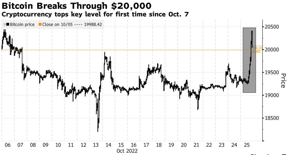 智通财经APP获悉,比特币突破2万美元大关,结束了自2020年底以来低于该水平的最长时间。比特币周二上涨5.3%,至20,412美元,创下9月27日以来最大单日涨幅。近三周以来,该代币的交易价格一直低于2万美元,打破了该代币标志性的波动性。其他数字资产紧随其后,以太币上涨了12.8%,至1525美元,这是一个多月来的最高价格。