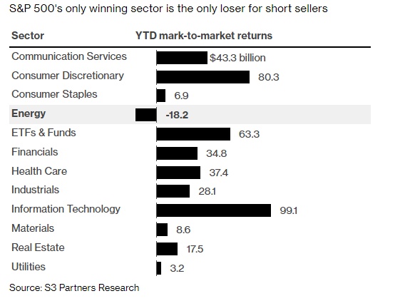 投资者此前争相建立能源板块的空头头寸,尤其是针对西方石油、埃克森美孚和雪佛龙等大型油气公司。然而这些股票均出现上涨,如果能源板块继续反弹,S3 Partners预计会有更多空头回补。