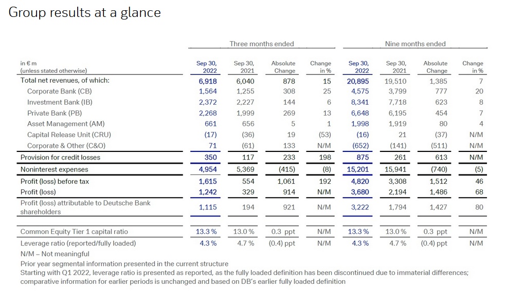 智通财经APP获悉,10月26日(周三)美股盘前,德意志银行(DB.US)公布了其2022年第三季度财务业绩。财报显示,德意志银行第三季度净营收为69.18亿欧元,上年同期为60.40亿欧元,同比增长15%。