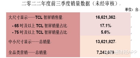 10月21日,TCL电子公布2022年前三季度全球销售量数据,再一次呈现了公司全球化战略持续精进,智屏业务大屏化、高端化战略取得突出成效,业绩增长原动力进一步夯实。