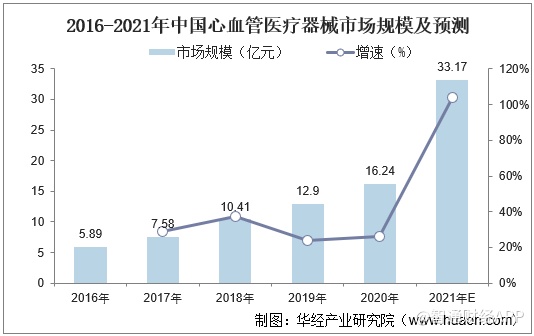 数据显示,2016年中国心血管医疗器械行业市场规模为5.89亿元,到2020年增长至16.24亿元,预计到2021年中国心血管医疗器械行业市场规模将增长至33.17亿元。