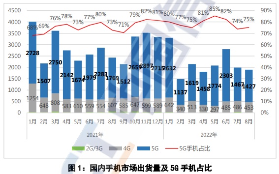 智通财经APP获悉,10月26日,中国信通院发布2022年8月国内手机市场运行分析报告。数据显示,2022年8月,国内市场手机出货量1897.9万部,同比下降21.9%,其中,5G手机1426.8万部,同比下降19.3%,占同期手机出货量的75.2%。