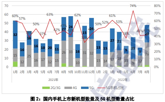 2022年8月,国内手机上市新机型48款,同比下降15.8%,其中5G手机20款,同比下降25.9%,占同期手机上市新机型数量的41.7%。2022年1-8月,上市新机型累计271款,同比下降8.4%,其中5G手机141款,同比下降4.7%,占同期手机上市新机型数量的52.0%。