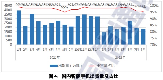 2022年8月,智能手机出货量1813.5万部,同比下降21.4%,占同期手机出货量的95.6%。2022年1-8月,智能手机出货量1.71亿部,同比下降22.9%,占同期手机出货量的97.7%。