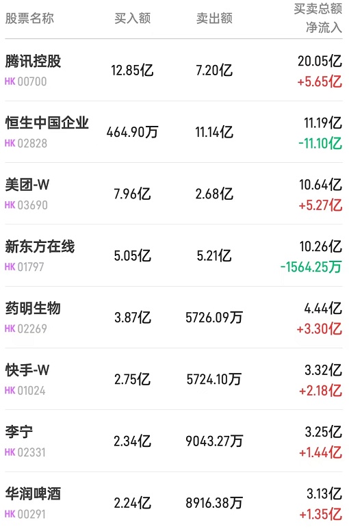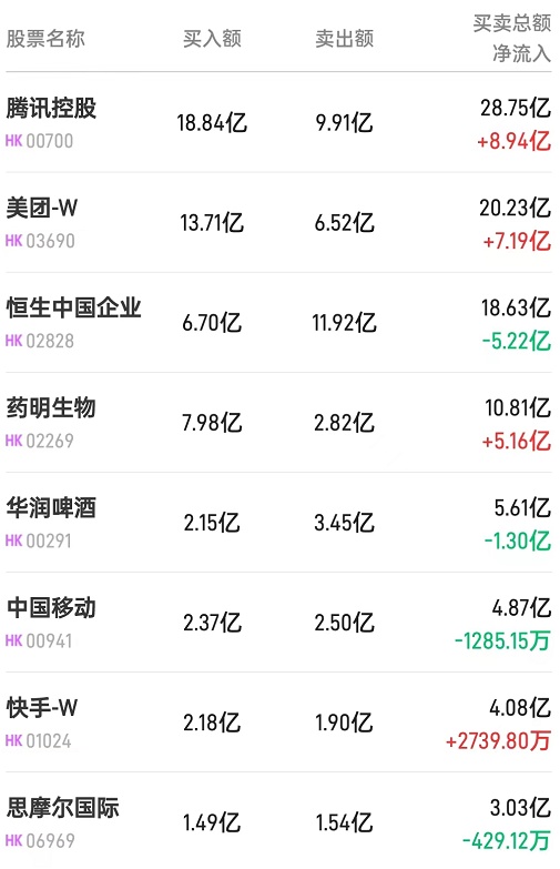 此外,中芯国际(00981)、华润啤酒(00291)分别获净买入5173万、510万港元。而恒生中国企业(02828)、中国移动(00941)分别遭净卖出16.31亿、1285万港元。