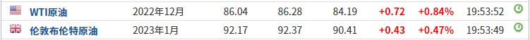 3. 截至发稿,WTI原油涨0.84%,报86.04美元/桶。布伦特原油涨0.47%,报92.17美元/桶。