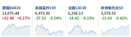 2. 截至发稿,德国DAX指数涨0.17%,英国富时100指数跌0.54%,法国CAC40指数跌0.23%,欧洲斯托克50指数跌0.42%。