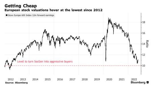 然而,法兴银行策略师周三表示,如果欧洲斯托克600指数的预期市盈率跌破10倍,他们将更积极地买入该地区股票。目前,欧洲斯托克600指数的市盈率仅略低于11倍,徘徊在十年来的最低估值水平。