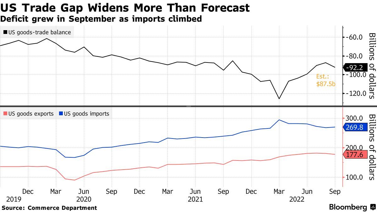 智通财经APP获悉,美国9月份商品贸易逆差6个月以来首次扩大,进口额持续增长,整体出口额出现大幅下降。美国商务部周三公布的最新数据显示,美国上个月贸易差额扩大5.7%,至922亿美元,这一数据暂未经通货膨胀因素调整。彭博社对经济学家的调查显示,经济学家预期中值为875亿美元。