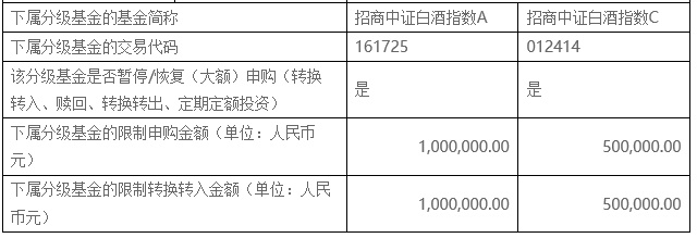 招商基金曾于2021年12月29日发布公告,自2022年1月4日起恢复招商中证白酒指数证券投资基金的申购(含定期定额投资)和转换转入业务,同时继续暂停改基金A类份额大额申购(含定期定额投资)和转换转入业务,如单日单个基金账户单笔或累计申请金额超过20万元,该基金有权部分或全部拒绝;继续暂停本基金C类份额大额申购(含定期定额投资)和转换转入业务,如单日单个基金账户单笔或累计申请金额超过10万元,该基金有权部分或全部拒绝。