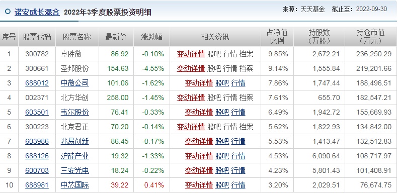具体来看,诺安成长混合前十大重仓股分别为(300782.SZ)、圣邦股份(300661.SZ)、中微公司(688012.SH)、北方华创(002371.SZ)、韦尔股份(603501.SH)、北京君正(300223.SZ)、兆易创新(603986.SH)、沪硅产业-U(688126.SH)、三安光电(600703.SH)、中芯国际(688981.SH)。