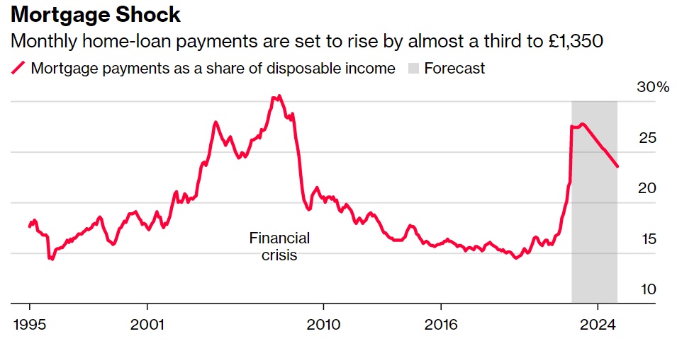 英国关键抵押贷款的成本仍接近2008年金融危机以来的峰值水平,这场危机正在减少有能力购买房产的人数。这也提高了需要再融资贷款的借款人的成本,在英国市场,这种情况通常至少每五年发生一次。