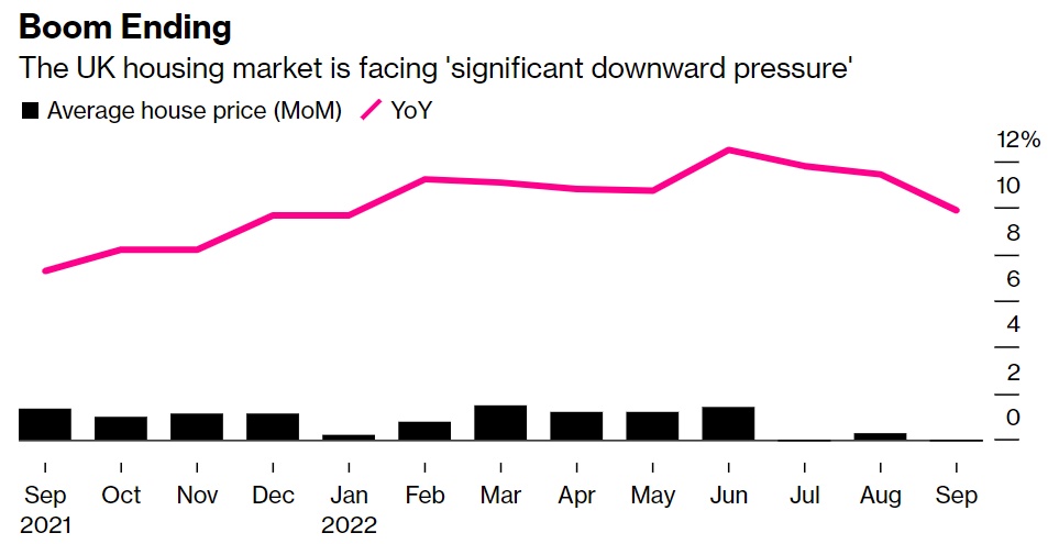 以英国首相换人而达到高潮的政治动荡也给市场带来了压力。最近几周,特拉斯的无资金支持的减税计划吓坏了投资者,推高了金融市场的利率。虽然随着迷你预算措施的180度大转弯,这些利率已大幅下降,但抵押贷款利率尚未回到夏季的普遍水平。