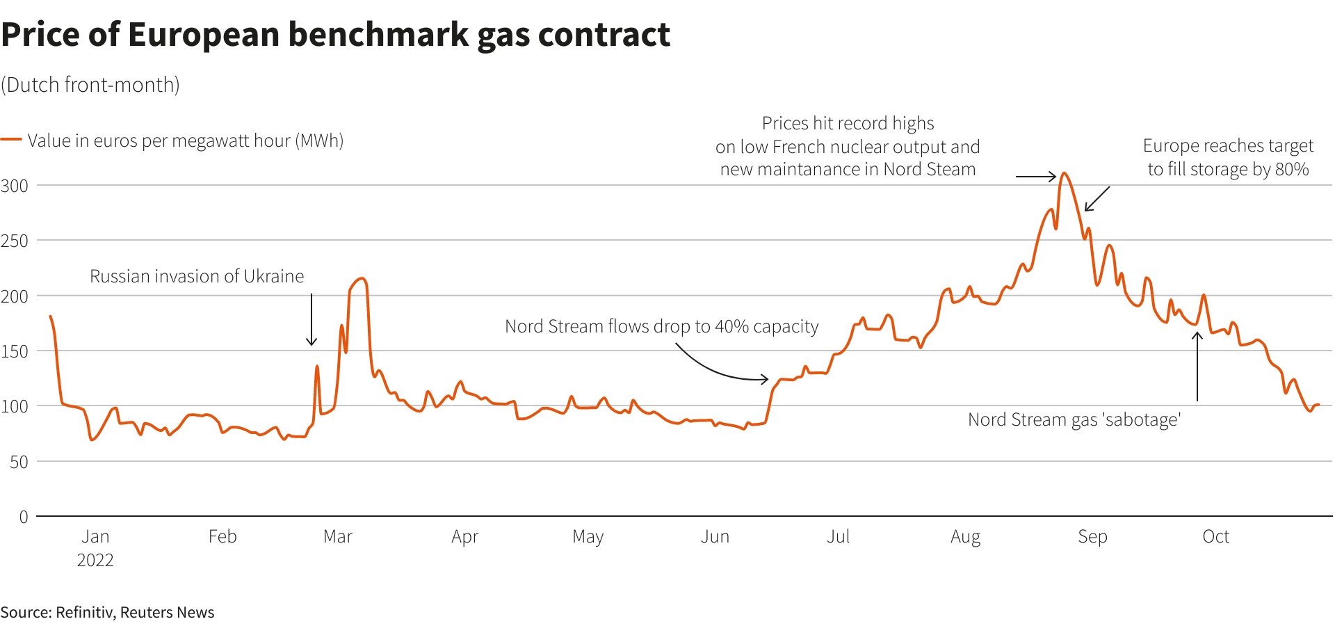 欧洲近期风力发电量一直居于高位,这降低了发电厂对天然气的需求。此外,欧盟国家在降低天然气价格和消费方面达成的合作协议也起到了作用。欧盟计划在全欧盟范围内对天然气价格设置上限,并建立一个更直接的机制来避免天然气价格的极端波动,这些举措都令天然气价格承压。