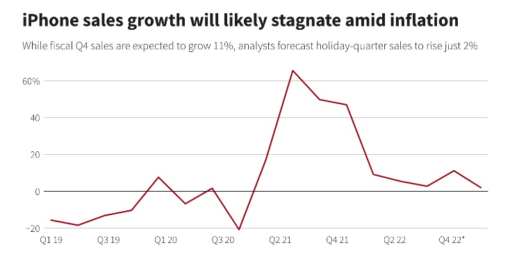 智通财经APP获悉,苹果(AAPL.US)将于本周四美股盘后发布第四季度财报,预计该季度的iPhone销售增长是今年最好的,但它仍可能预示着一个艰难的假期消费季,因为市场需求放缓,通胀达到几十年来的高点。
