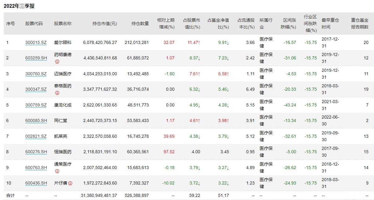 三季报数据显示,该基金前十大重仓股分别为爱尔眼科(300015.SZ)、药明康德(603259.SH)、迈瑞医疗(300760.SZ)、泰格医药(300347.SZ)、康龙化成(300759.SZ)、同仁堂(600085.SH)、凯莱英(002821.SZ)、恒瑞医药(600276.SH)、通策医疗(600763.SH)、片仔癀(600436.SH)。其中,葛兰增持爱尔眼科、药明康德、同仁堂、凯莱英,减持迈瑞医疗、通策医疗、片仔癀。