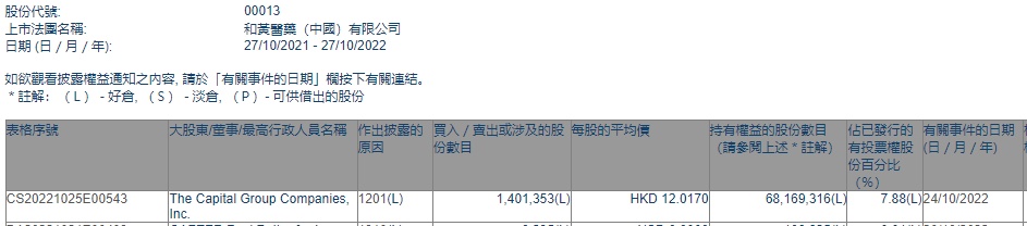 智通财经APP获悉,香港联交所最新资料显示,10月24日,美国资本集团减持和黄医药(00013)140.1353万股,每股作价12.017港元,总金额约为1684.01万港元。减持后最新持股数目约为6816.93万股,最新持股比例为7.88%。
