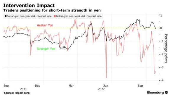 来自期权市场的信号表明,交易员正在认真对待日本政府采取行动的威胁。美元兑日元的一周风险逆转指标(衡量美元兑日元未来一段时间内走势的指标)仍远低于零,尽管较长期风险逆转指标显示投资者持观望态度。