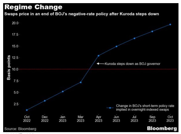 隔夜指数掉期继续表明,一旦黑田东彦在明年 4 月卸任行长,日本央行将立即将其短期政策利率从负 0.1% 上调。目前除两年期票据外,所有基准期限的收益率均高于零。