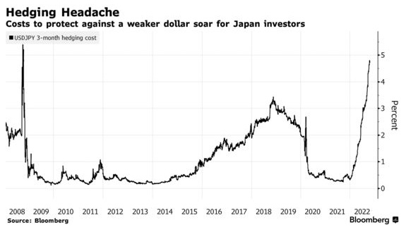 对冲波动日元的成本螺旋式上升,是外汇市场形势不妙的另一个信号。市场测算的3个月日元兑美元对冲成本飙升至近5%,为金融危机以来的最高水平。