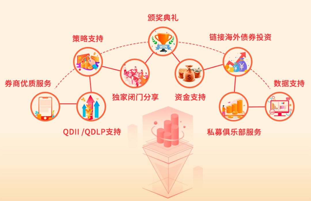 本次大赛为参赛机构提供九大参赛权益,包括:颁奖典礼授予荣誉奖杯、独家中小市值投资机会闭门分享、链接优质海外债券投资、资金支持、QDII /QDLP支持、私募俱乐部服务、策略支持、券商优质服务、数据支持。