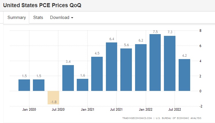 通货膨胀数据方面则有一些好消息。根据消费者行为进行调整的生活成本指数——连锁加权价格指数在第三季度上涨4.1%,远低于经济学家预测的5.3%的涨幅。此外,GDP数据中的个人消费支出价格指数(PCE)——也就是美联储青睐的通胀指标,仅上涨了4.2%,较上一季度的7.3%大幅下降。