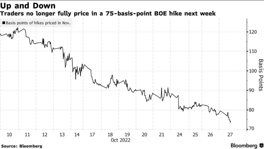 智通财经APP获悉,随着英国政府制定紧缩政策以修复公共财政,当地交易员正在降低对利率的预期。根据与英国央行政策日期挂钩的利率掉期数据显示,货币市场目前押注英国央行下周升息幅度不到75个基点,与一个月前交易员押注最多升息200个基点相比,情况出现了大幅逆转。如今,市场预期银行利率将在明年达到5%以下的峰值,而上个月为6.25%以上。